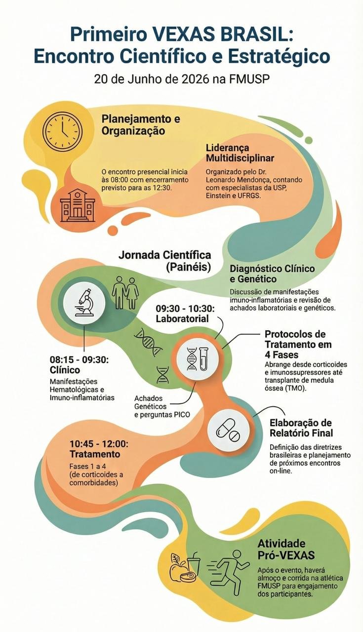 O Brasil sediará, no dia 20 de junho de 2026, o Primeiro VEXAS Brasil – Encontro Científico e Estratégico, um evento inovador que reunirá especialistas de referência nacional e internacional para discutir uma das condições mais desafiadoras da medicina atual: a síndrome VEXAS.